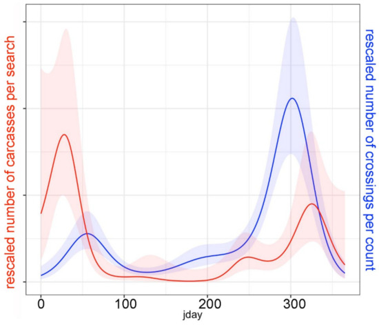Annual phenology of relative number of corrected carcasses (red line) vs. crossing birds (blue line). Both measures were scaled to the same height for better visualization (i.e., divided by respective mean value and are thus unitless), and the y-axis therefore cannot be interpreted in absolute values and only relative changes along the x-axis are important. Curves based on GAM regressions; colored shaded areas indicate 95% confidence intervals. X-axis: Julian day (continuous count of days starting from 1 January).