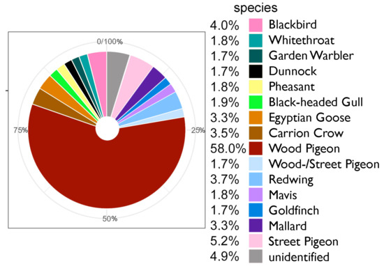 An analysis of the species spectrum of the (corrected) carcasses is shown in Figure 4. Most victims were Wood Pigeons (Columba palumbus, 58%), while the addition of Street Pigeons (Columba livia domestica) increased the proportion of pigeons to approximately 65%. The second most common species were thrushes (Eurasian Blackbird (Turdus merula), Redwing (Turdus iliacus) and Song Thrush (Turdus philomelos)), accounting for 9.5% of the total.