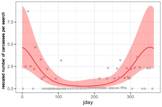 Number of carcasses per search run, depending on time of year. Grey dots: (corrected) carcass numbers per survey; red line: generalized additive model-based estimation of average carcass numbers per search (regression spline with 5 nodes); red shaded areas: 95% confidence intervals; x-axis: Julian day (continuous count of days starting from 1 January).