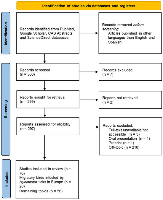 The remaining 56 articles were used as the basis for a narrative approach to examine evidence of CCHFV in Europe; to discuss the role of Hyalomma spp. as vectors of CCHFV and their distribution in Europe; to introduce the theme concerning the role of migratory birds in the dispersal of Hyalomma spp. across Europe; to provide an overview of the migratory patterns of bird species reported to be infested by Hyalomma spp. in non-endemic regions and by CCHFV-positive Hyalomma ticks; and to discuss the impact of climate change on the expansion of Hyalomma spp. The selected records per topic are listed in the Supplementary Materials (Table S2).