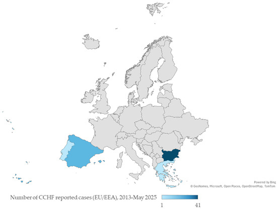 Distribution of Crimean-Congo Haemorrhagic Fever (CCHF) cases in the EU/EEA, 2013–May 2025. Adapted from ECDC [27].