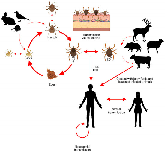 Hyalomma ticks can become infected by CCHFV when feeding on infected host (Figure 3). Immature ticks prefer to feed on rodentia, lagomorpha, and aves, while adults infest large ungulates, with a lower yet notable preference for lagomorpha and suidae [45].