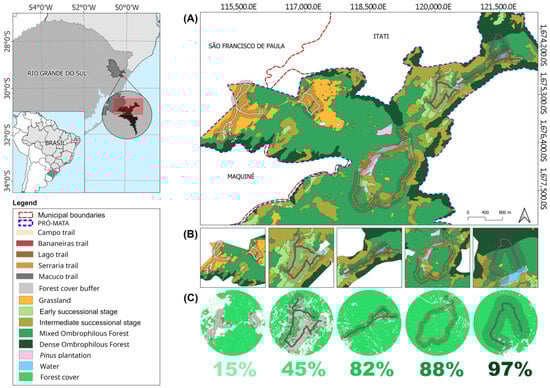 Map of the study area within the Pró-Mata Private Natural Heritage Reserve (RPPN), located in the municipality of São Francisco de Paula, in the northeast region of the State of Rio Grande do Sul (RS), Brazil. The trails and their 100 m buffers (sites) are represented on the RPPN map, displaying vegetation cover types in a general overview (A), in detail (B) and the proportion of forest cover (C) in the trails CAM = 15%, BAN = 45%, LAG = 82%, SER = 88% and MAC = 97%. Adapted from Pró-Mata Management Plan [].