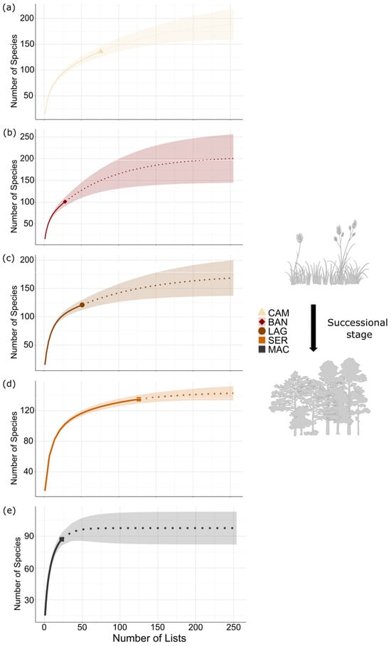 Species accumulation curves based on presence–absence (incidence) data from five trails at RPPN Pró-Mata, Rio Grande do Sul, Brazil. Solid and dashed lines represent interpolated and extrapolated estimates, respectively, obtained using the rarefaction and extrapolation method with 95% confidence intervals. Symbols represent the observed number of species as a function of the number of MacKinnon lists. CAM: Campo (a), BAN: Bananeiras (b), LAG: Lago (c), SER: Serraria (d), MAC: Macuco (e).