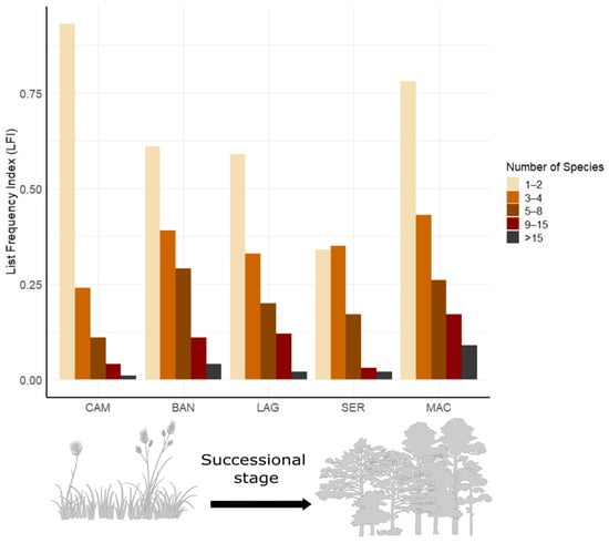 Only six species were recorded in more than 100 lists, with the White-browed Warbler (Myiothlypis leucoblephara) being the most frequent (161 lists), followed by the Diademed Tanager (Stephanophorus diadematus) (149 lists) and the Rufous-collared Sparrow (Zonotrichia capensis) (119 lists). Conversely, 91 species were detected in fewer than 10 lists, many of which were grassland-associated species—such as the threatened Black-and-white Monjita and the least concern Grassland Yellow-Finch, both recorded only twice. A complete list of species and their frequency indices is provided in Table S2. The LFI provided a complementary perspective on species rarity and frequency across the different trails (Figure 3). Groups composed of few species (e.g., 1–2 or 3–4 species) tended to exhibit higher LFI values, indicating species that were consistently present in the lists. In contrast, groups with a larger number of species (>15 species) showed lower LFI values, suggesting that these species were recorded less frequently and could be considered rare, occasional, or difficult to detect. This pattern was particularly evident on the MAC trail, which showed the highest proportion of species with low frequency (LFI < 0.25). On the other hand, only a few species reached high LFI values, indicating consistent presence in the samples and a possible association with specific successional stages.