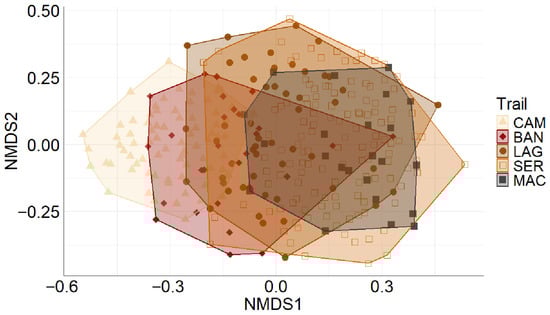 The species accumulation curves showed different patterns among the five trails (Figure 2a–e, Table 3). Only the MAC trail reached an asymptote, while SER showed a trend toward stabilization but continued to increase slightly. In contrast, the accumulation curves for LAG, BAN, and particularly CAM exhibited a clear upward trend, indicating that additional sampling effort is needed for a more complete inventory on those trails.