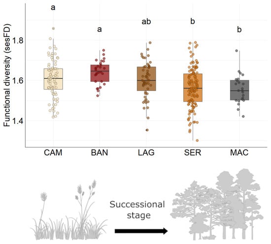 Boxplot of functional diversity among the different sites along a forest cover gradient, from less cover or initial stage of succession (IN, left) to more forest cover, advanced succession stage (AS, right). The central line of each box represents the median, and the dots represent the values of each sampling unit. The letters above the boxes indicate statistically significant differences between the sites based on Tukey’s test (p < 0.05). CAM: Campo, BAN: Bananeiras, LAG: Lago, SER: Serraria, MAC: Macuco.