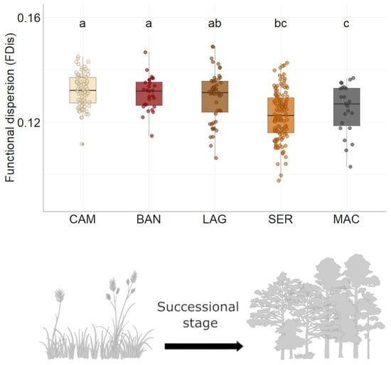 Boxplot of the functional dispersion (FDis) among the different sites along a forest cover gradient, from less cover or initial stage of succession (IN, left) to more forest cover, advanced succession stage (AS, right). The central line of each box represents the median, and the dots represent the values of each sampling unit. The letters above the boxes indicate statistically significant differences between sites based on Tukey’s test (p < 0.05). CAM: Campo, BAN: Bananeiras, LAG: Lago, SER: Serraria, MAC: Macuco.