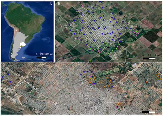 The study was conducted in two cities in the southwest of Buenos Aires province, Argentina: Bahía Blanca and Coronel Pringles, both included in the Pampas ecoregion, characterized by a temperate subhumid climate with hot summers and cool winters, and an average annual precipitation ranging from 600 to 800 mm [41]. Natural vegetation in this region is dominated by grasslands with scattered shrubs and riparian woodlands, although much of the original cover has been replaced by agriculture, livestock, and urban development [42]. Bahía Blanca is a coastal city, approximately 600 km southwest of Buenos Aires. With a population of ca. 337,000 according to the 2022 national census, it ranks among the most populous cities in the province and functions as a regional hub of commerce, education and industry. In contrast, Coronel Pringles is a smaller inland city situated about 120 km northeast of Bahía Blanca, near the Ventania mountains. It has lower building density, with a population of ca. 24,500 as of the 2022 census, and is surrounded by extensive agricultural lands and remnants of natural vegetation, giving it a landscape context that contrasts with the more densely urbanized Bahía Blanca. Despite their geographical proximity and their location more or less on the same latitude and at similar heights above sea level, differences in the size of both cities may result in disparities in microclimates [43], and habitat availability and quality.