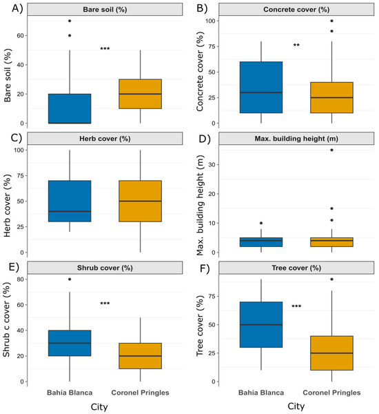 Habitat variables recorded at Bahía Blanca (orange) and Coronel Pringles (blue), Buenos Aires province, Argentina. Variables include percentage cover of bare soli (A), concrete (B), herbs (C), shrubs (E), and trees (F), and maximum building height (D). Boxes represent the interquartile range, with the median indicated by a horizontal line. Points beyond this range are shown as outliers. Asterisks indicate statistically significant differences between cities based on Wilcoxon rank-sum tests: p < 0.01 (**), p < 0.001 (***).
