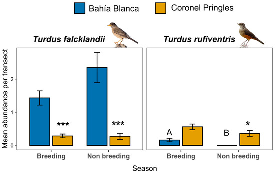 Mean abundance (± standard error) of Austral Thrush (Turdus falcklandii) and Rufous-bellied Thrush (Turdus rufiventris) during the breeding and non-breeding seasons in transects at Bahía Blanca and Coronel Pringles, Buenos Aires province, Argentina. Asterisks indicate statistically significant differences between cities within the same season as calculated by Wilcoxon rank-sum tests: p < 0.05 (*), p < 0.001 (***). Different letters (A, B) indicate significant differences between seasons within the same city (p < 0.05).