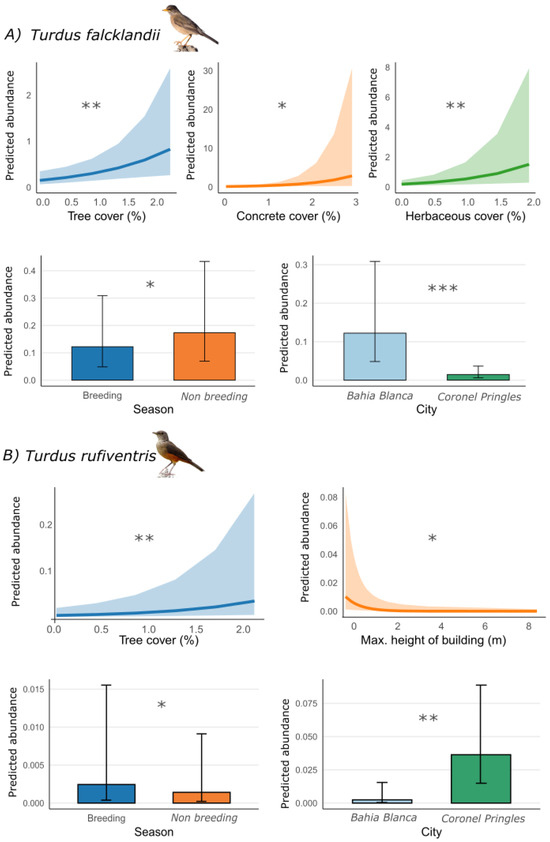 Predicted abundance of Austral Thrush (Turdus falcklandii) (A) and Rufous-bellied Thrush (Turdus rufiventris) (B) in Bahía Blanca and Coronel Pringles, Buenos Aires province, Argentina, across predictors retained in the best-fitting Poisson model. Top row: effects of significant continuous predictors showing the relationship between expected abundance and percentage cover of trees, concrete, and herbs and grasses, and maximum height of building (m). Shaded ribbons represent 95% confidence intervals. Bottom row: predicted abundance across seasons (left) and cities (right), based on the model, and represented by boxplots displaying the median and the interquartile range. Vertical error bars also denote 95% confidence intervals. Number of asterisks indicate the strength of statistical significance: p < 0.05 (*), p < 0.01 (**), p < 0.001 (***).