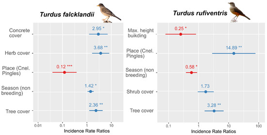 Incidence rate ratios (IRRs) and 95% confidence intervals for predictors retained in the final Poisson model explaining the abundance of Austral Thrush (Turdus falcklandii) and Rufous-bellied Thrush (Turdus rufiventris) in Bahía Blanca and Coronel Pringles, Buenos Aires province, Argentina. An IRR greater than 1 indicates a positive association with abundance, while values below 1 indicate a negative effect. The IRR = 1 represents a null effect. Values are based on the top-ranked GLMM. While inference in the main text is based on model-averaged coefficients (ΔAICc < 2), the top model is shown here for clarity of presentation. Number of asterisks indicate the strength of statistical significance: p < 0.05 (*), p < 0.01 (**), p < 0.001 (***).