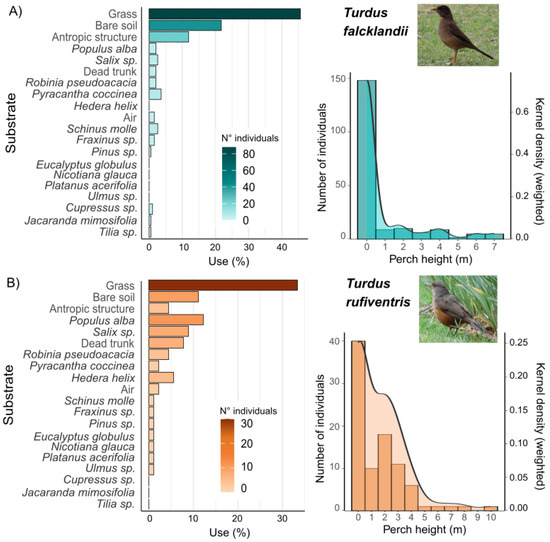 Both species exhibited distinct patterns of microhabitat use in terms of height (χ2 = 42.7, p < 0.001) and substrate selection (Figure 6). Austral Thrush was most frequently observed on the ground, with most detections on grass (46% of observations) or bare soil (22%). A smaller proportion of individuals used anthropic structures (12%), and very few (less than 20%) were recorded perching on trees or shrubs (Figure 6). In contrast, Rufous-bellied Thrush was recorded predominantly on woody vegetation (43%), followed by grass (33%) and bare soil (11%). This species frequently used trees, such as Populus and Salix species, and was also recorded using Hedera helix, a vine not used by Austral Thrush (Figure 6B). These contrasting patterns highlight the Austral Thrush’s specialization in ground-level foraging versus the Rufous-bellied Thrush’s greater use of arboreal and mid-story habitats.