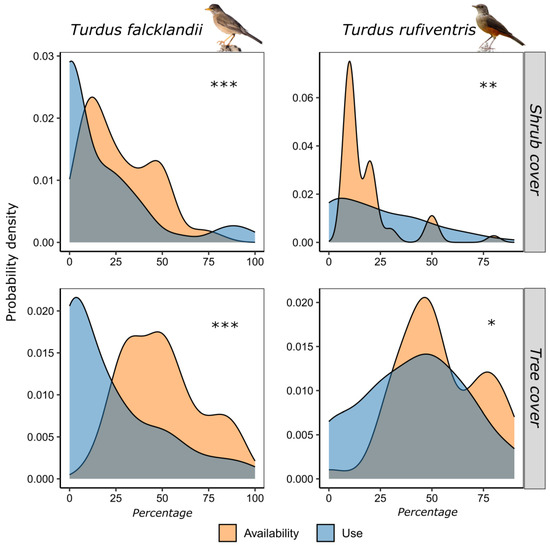 Percentage cover of trees and shrubs at transects where Austral Thrush (Turdus falcklandii) and Rufous-bellied Thrush (Turdus rufiventris) were recorded in Bahía Blanca and Coronel Pringles, Buenos Aires province, Argentina. The curves represent kernel density estimates of the distribution of vegetation cover values. Orange areas represent habitat availability at the transect level, and blue areas in 1.5 m surrounding individual bird observations. Asterisks indicate significant differences between availability and use based on Kolmogorov–Smirnov tests. Number of asterisks indicate the strength of statistical significance: p < 0.05 (*), p < 0.01 (**), p < 0.001 (***).