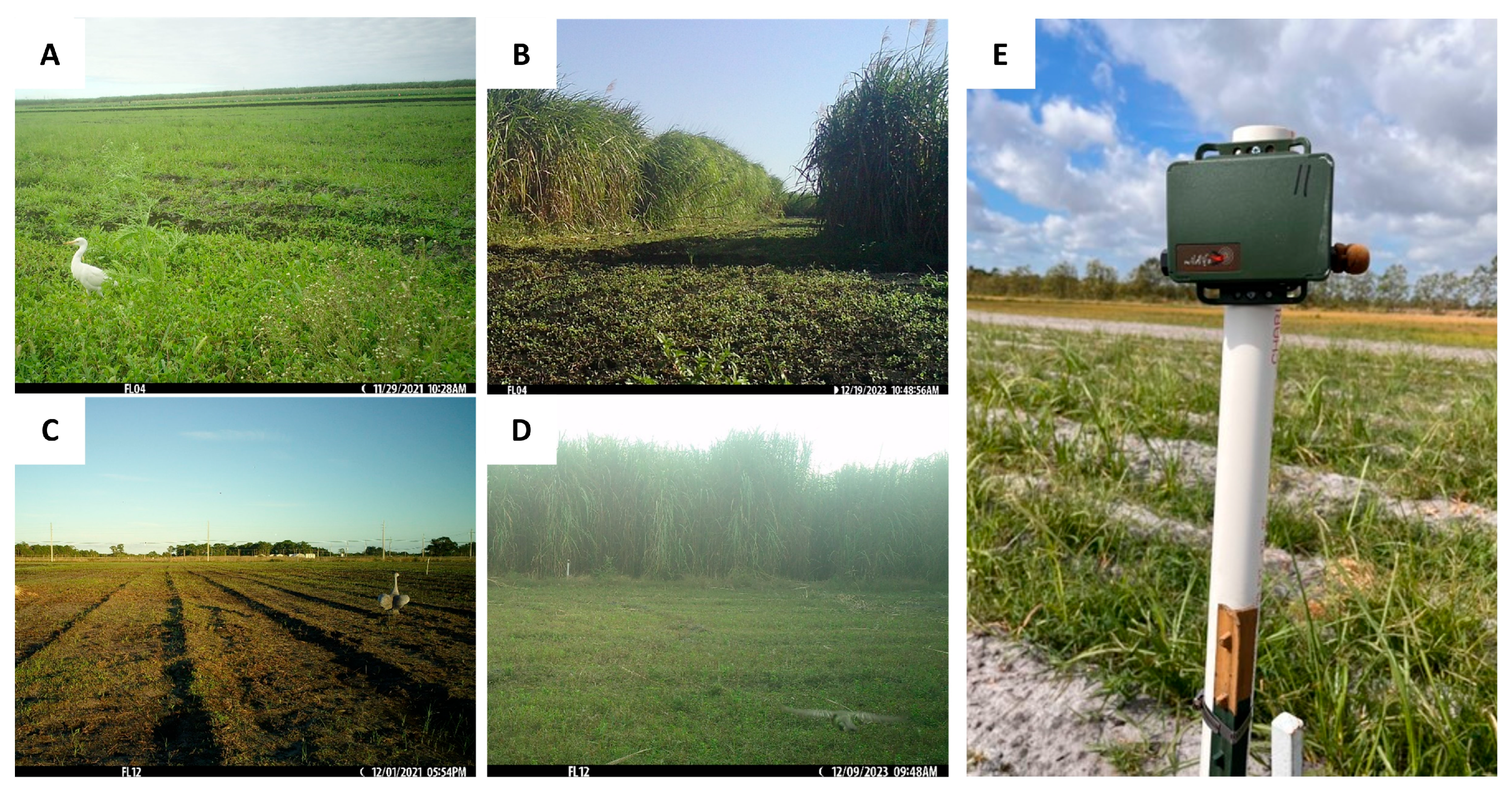 - Pearlstine, E.V.; Mazzotti, F.J.; Rice, K.G.; Liner, A. Bird observations in five agricultural field types of the Everglades Agricultural Area in summer and fall. Fla. Field Nat. 2004, 32, 75–127. [Google Scholar]
