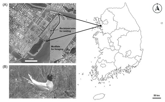 Map of study site enclosed by a dashed line with focal species used to investigate the nest defense behavior of Saunders’s Gulls (Saundersilarus saundersi): (A) a breeding colony located in a reclaimed coastal area in Incheon Bay of South Korea; (B) an incubating Saunders’s Gull on its nest.