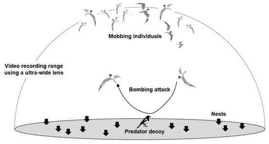 Measurement of nest defense behaviors (latency time, number of bombing attacks, and number of mobbing individuals) in a breeding colony of Saunders’s Gulls (Saundersilarus saundersi). Observations were conducted using a smartphone recording function equipped with an ultrawide (180°) lens in the presence of predator and neutral decoys—Oriental Magpie (Pica serica), common raccoon dog (Nyctereutes procyonoides), and Little Tern (Sternula albifrons). Here, arrows indicate the direction of bombing attacks. The dashed-line area represents the observation range covered by the ultrawide lens.