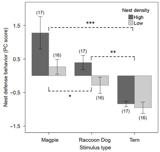 Variation in nest defense behavior of Saunders’s Gulls as a function of nest density (high vs. low) and predator stimulus type (Oriental Magpie as a diurnal avian predator, common raccoon dog as a nocturnal mammalian predator, and Little Tern as a neutral co-nester). Bars represent mean ± 1 SE composite scores (i.e., degrees of nest defense) derived from latency time, bombing attack rate, and number of mobbing individuals using Principal Component Analysis. Asterisks above the bars indicate the significance of density-dependent pairwise differences among treatments (LSD post hoc test; * p < 0.05, ** p < 0.01, *** p < 0.001). Numbers in parentheses indicate sample sizes.