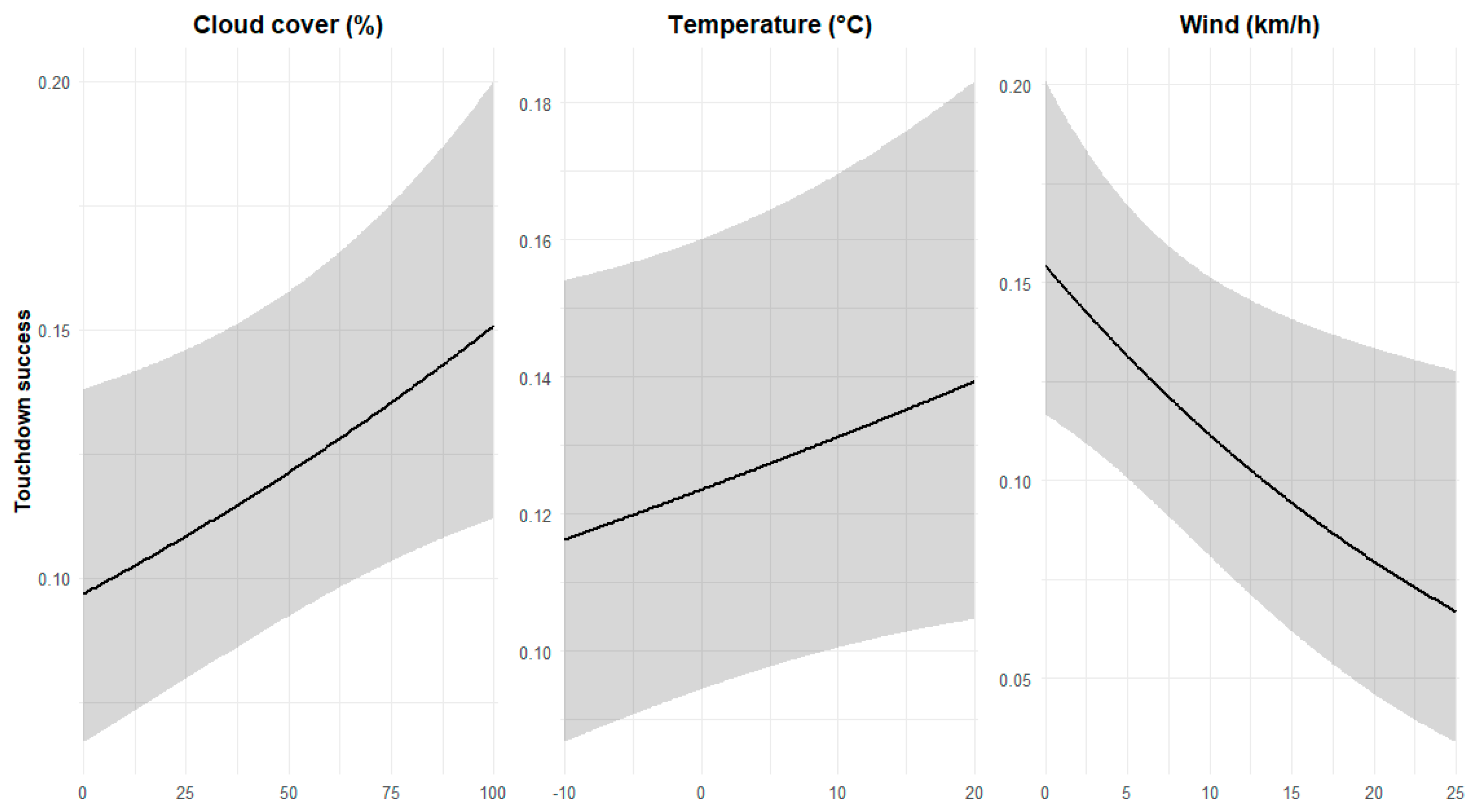 - Increasing wind speed would reduce touchdown success, by constraining flight control and strike precision.