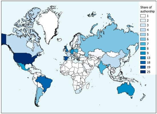 We are very proud that the first authorship of the papers published in Birds is very widespread, covering 46 countries (Figure 3). Most of the first authors of the papers published in Birds thus far are from the USA (18%), Spain (14%), Brazil (13%), UK (9%), Australia (6%) and Germany (6%) (Figure 3). This share corresponds quite well with the data of Ibis [2], in which the top author countries (with a share of at least 8%) were the UK, Canada, Spain, the USA, and Australia, as well for the Journal of Avian Biology [4], in which the top author countries (with a share of at least 6%) were the UK, Spain, Australia, China, and Germany during the year 2024. In general, the top five first author countries in Birds remained quite stable during the years 2021–2025. The USA and Spain have been included for five years; the UK and Brazil for three years; Australia and India for two years; and Germany, New Zealand, Canada, Argentina, Mexico, and South Africa for one year.