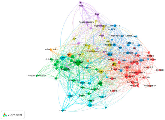 A Network Visualization [7] of the papers published in Birds based on the titles and abstracts of the articles published during the years 2021–2025. Each color indicates a grouping of items (e.g., keywords) that are more closely related to each other than to items in other groups. The size of the dots (nodes) represents the importance or frequency of that item within the network.