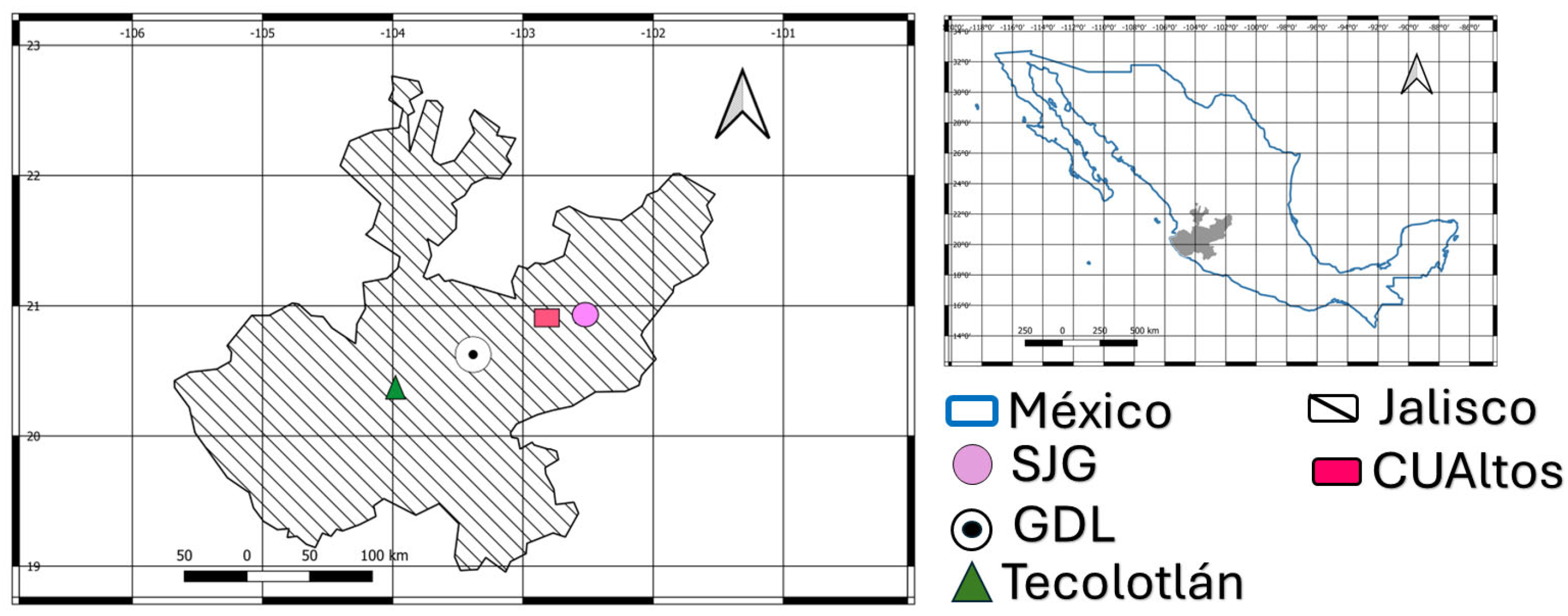 The Centro Universitario de los Altos (CUAltos) of the University of Guadalajara (20°47′01″ N, 102°43′41″ W), also located in Tepatitlán de Morelos, was designated as the semi-urban site. Its landscape consists of a mosaic of rural vegetation interspersed with agroindustrial facilities and bordered by residential areas, representing an intermediate transition between urban and rural environments.
