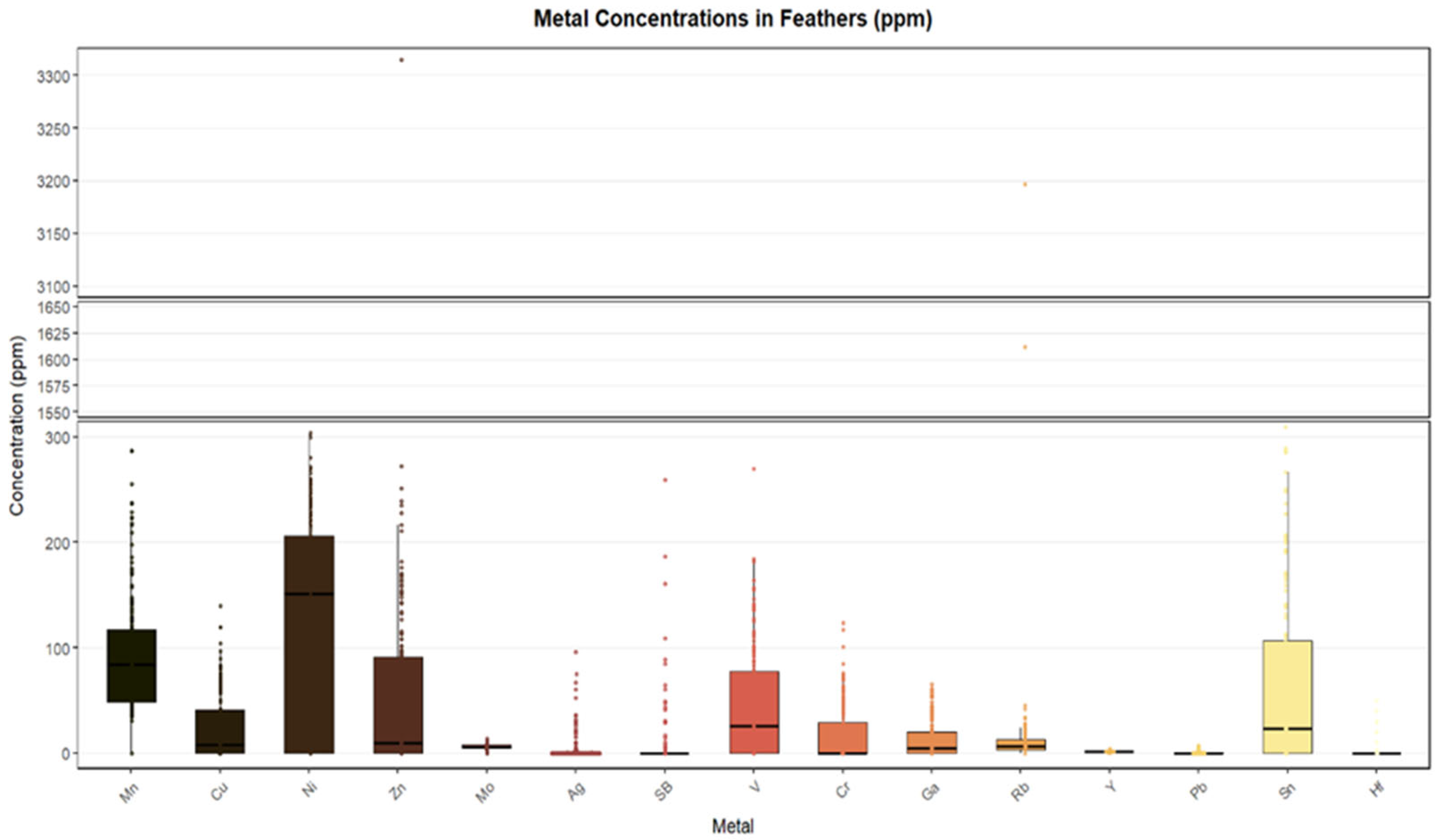 Figure 2. Concentrations of detected metals (ppm) in feather samples across all individuals. Boxplots show the median, interquartile range, and 1.5 × IQR whiskers; points represent individual measurements. Breaks in the y-axis are included to visualize extreme values without compressing the central distribution.