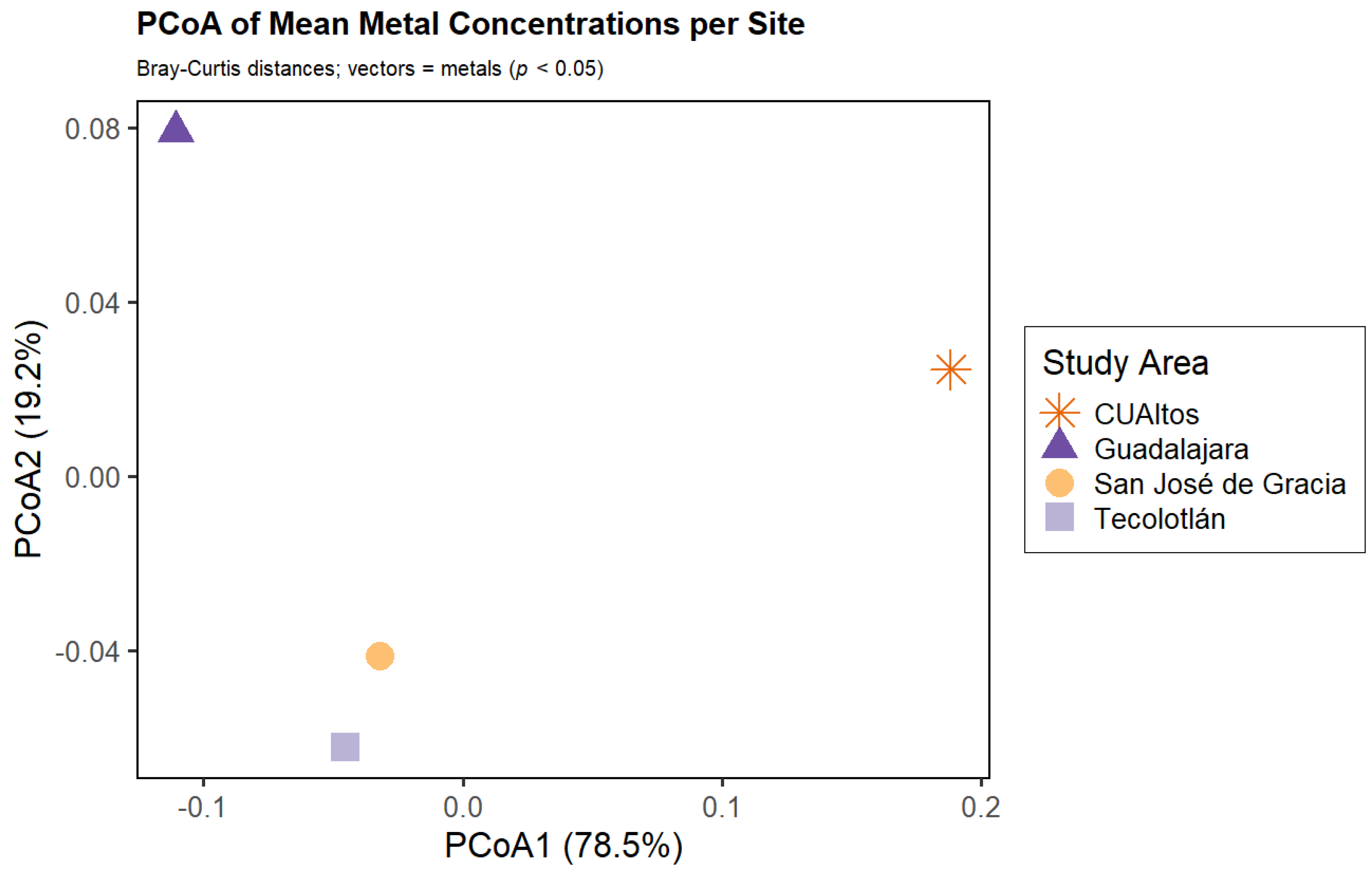 Figure 3. Principal Coordinates Analysis (PCoA) based on Bray–Curtis distances of mean metal concentrations per study area. Each point represents the centroid of average concentrations for each site. Axes indicate the proportion of total variation explained by the first two coordinates (PCoA1 = 78.5%, PCoA2 = 19.2%).