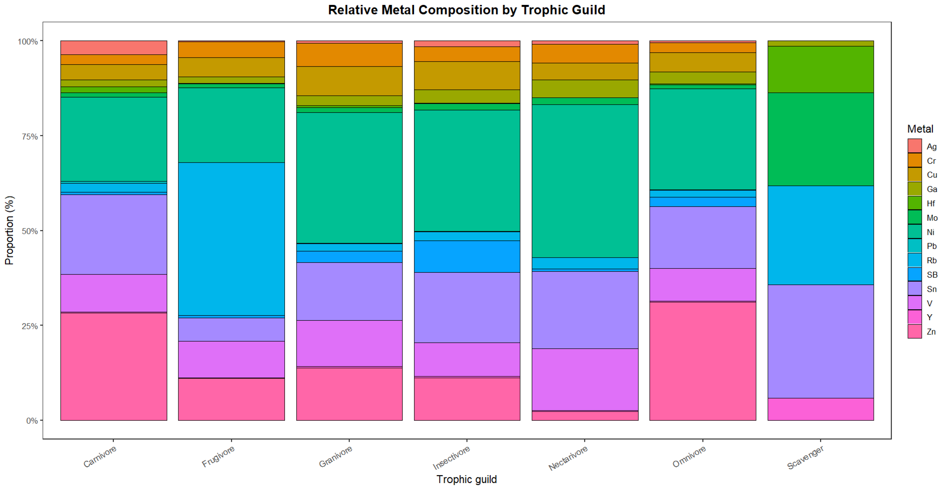 Figure 5. Relative composition of metal concentrations across trophic guilds in bird feathers. Bars show the proportional contribution of each metal within each guild. Although the absolute concentrations differ among species, the proportional profiles reveal consistent dominance of Zn, Y, Mo and Hf across guilds, while elements such as Sn, Ag and Ga appear in much lower proportions.