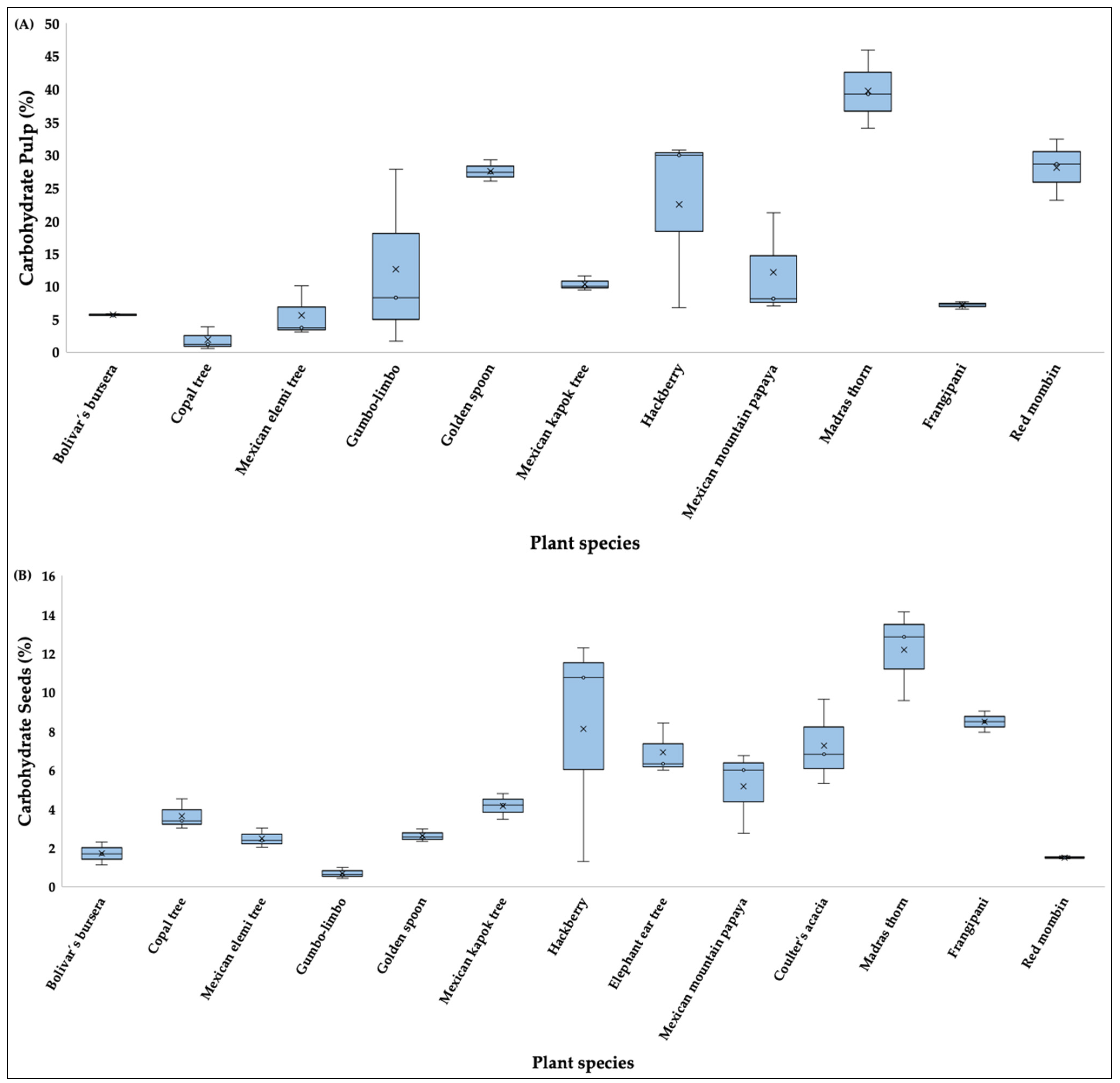 | Euphorbiaceae | Enterolobium cyclocarpum | Elephant ear tree | Seeds | Supplementary | B | O |