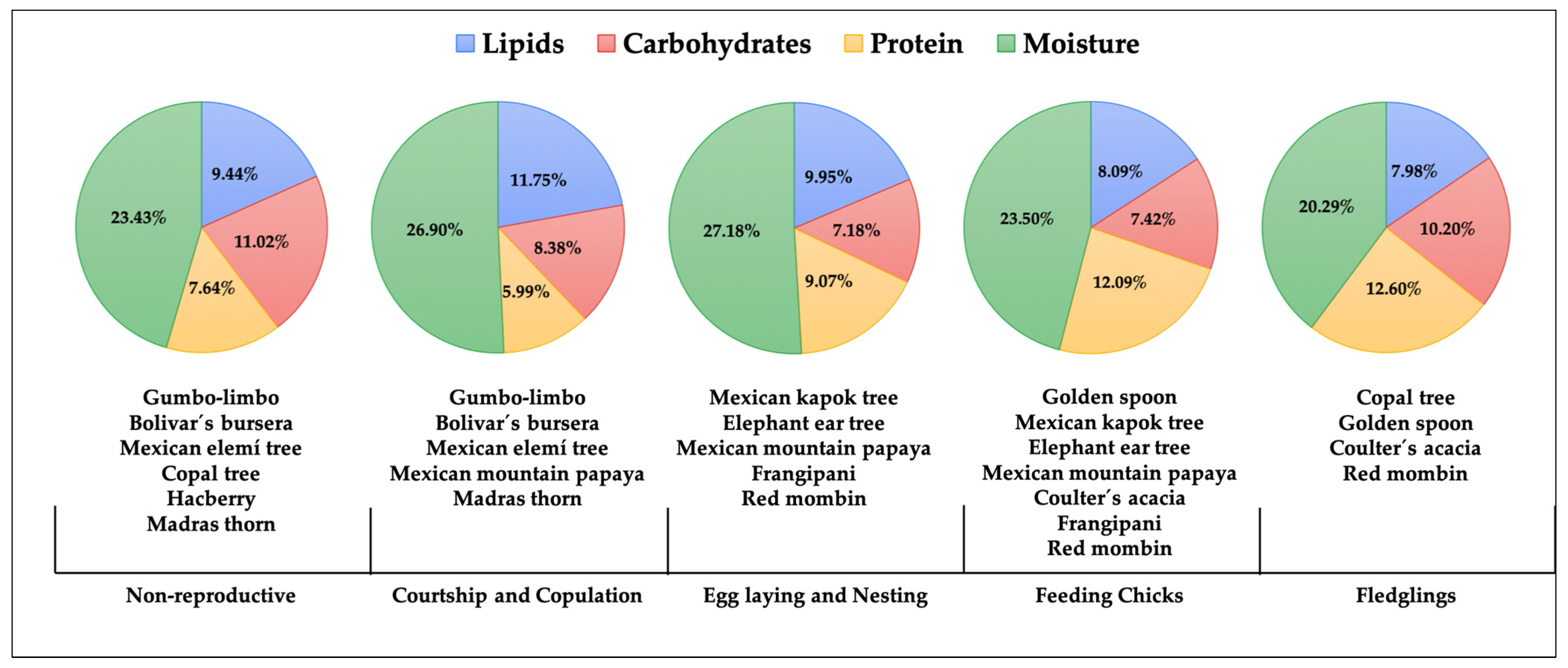 | Mexican kapok tree | Ceiba aesculifolia | Seeds | L, I | Dominant | Egg-laying and incubation | [22] |
