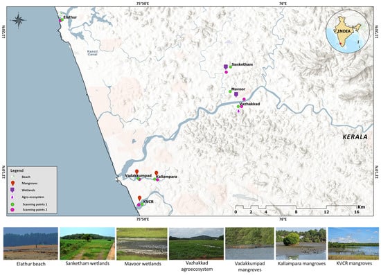 The study was carried out across seven sites situated in the northern region of Kerala: Kadalundi-Vallikkunnu Community Reserve (KVCR) mangroves, Kallampara mangroves, Vadakkumpad mangroves, Vazhakkad agroecosystem, Mavoor wetland, Sanketham wetland, and Elathur beach (Figure 1). All habitats fall under the Tropical Monsoon Climate (Am) zone, characterised by high rainfall (southwest and northeast monsoons), high relative humidity, and warm temperatures throughout the year [7,33]. Vegetation across the study landscapes ranges from agroecosystems dominated by mixed crops, to freshwater wetlands, coastal beaches, tidal mudflats, and true mangrove ecosystems along the Kozhikode coastline [7,34]. Elathur beach was included in the study due to the occurrence of the Black-capped Kingfisher, a winter visitor to Kerala.