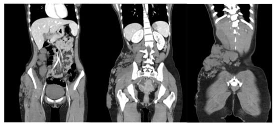 Abdominal and pelvic CT shows unilateral soft tissue hypertrophy with calcifications on the right side of the lower abdomen, lower back, buttock, and proximal thigh. Venous malformation in the right gluteal muscle and splenomegaly with multiple small vascular malformations were observed.