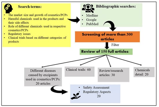 The high demand for cosmetics/PCP worldwide at all age groups has also elevated awareness associated with safety issues. In this review, a focus has been made on chemicals found in cosmetics/PCPs that are toxic and harmful to human health. This paper also highlights the regulatory issues and safety assessment of chemical ingredients and their related clinical trials. The search criteria of the key factors required in the given review have been mentioned in Figure 1.