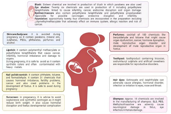 Despite all the positivitiess of cosmetics, we need to focus on safety measures of these hazards as it is a matter of human health. Chemicals and other ingredients present in these products can be hazardous []. A lot of these chemicals used as preservatives, UV filters, color additives, etc., can cause cancer, mutation, developmental and reproductive toxicity, endocrine disruption, etc., []. Most of the cosmetic products are applied on the skin, which results in the toxic/harmful chemicals penetrating the stratum corneum barrier and reaching the dermis of the human skin, and may further reach the systemic circulation []. Hence, it is capable of disrupting fertility during pregnancy and causing female reproductive disorders as shown in Figure 2. All the ingredients in the beauty products meet certain regulatory obligations, but some ingredients are allowed at low concentrations due to their toxicity at higher concentrations. Facial wash or cleansers might not be ideally safe for regular use on or around the delicate and specialized dermal layer of eyelids. These face wash/cleansers contain sodium lauryl sulfates that remove delicate natural oil/moisture on eyelids by evaporation []. Globally, lip care products are high-selling cosmetic products in the modern era used to enhance self-esteem and make attractiveness, and moisturize the lips. In lip care products, chemicals such as dye, mineral mica, colorant, and shiner are incorporated during manufacturing to develop high-quality products and boost its effect. These chemicals contain trace metals such as antimony, arsenic, copper, etc., [] can cause severe adverse effects. Regular long-term use of lip care cosmetic reveal that when these trace metals are used in high quantity they can penetrate the systemic blood circulation causing damage of various organs [].