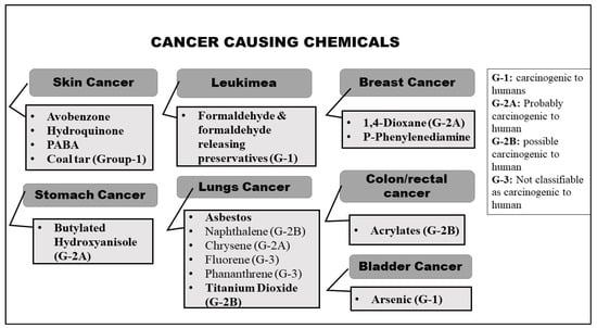 Cancer is a disease in which aberrant cells divide with no control and conquer nearby cells and tissues. Chemicals that are used in beauty care products either directly show carcinogenic effects or have a risk of causing cancer []. Fluorene and phenanthrene (group 3) along with naphthalene (group 2B), chrysene (group 2A), and titanium dioxide (group 2B) are carcinogenic agents capable of inducing lung cancer; however, other chemicals such as naphthalene, N-nitrosodiethanolamine (group 2A) can develop liver cancer. Similarly, chemicals such as butylatedhydroxyanisole (group 2A) can cause stomach cancer []. Formaldehyde and formaldehyde-releasing preservatives (group1) can cause leukemia (blood cancer). Some chemicals such as avobenzone, hydroquinone, and PABA present in the sunscreens are not carcinogenic but can increase the risk of having skin cancer, while coal tar (group 1) is carcinogenic that can cause skin cancer as shown in Figure 3 []. 1,4-Dioxane (group 2A) present in hair products can cause breast cancer, while p-phenylenediamine present in hair dyes can increase the risk of skin cancer []. Arsenic (group 1) can cause bladder cancer, and acrylates (group 2B) in nail products can cause colorectal cancer [].