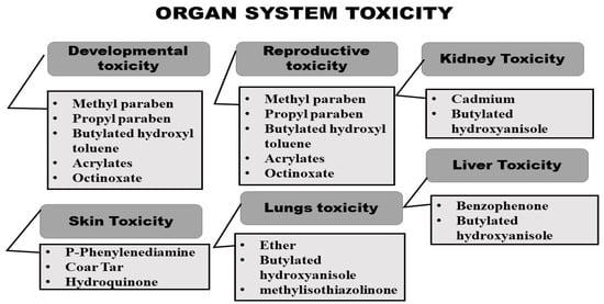Harmful ingredients present in beauty care products can accumulate in our bodies and might cause organ system toxicity []. As can be seen in Table 2 and Figure 4, many ingredients can cause various types of organ system toxicity. Substances such as methylparaben, propylparaben, butylated hydroxy-toluene, acrylates, and octinoxate (present in shampoos, sunscreen, and nail products) can cause developmental toxicity []. Substances such as p-phenylenediamine, coal tar, and hydroquinone can cause skin toxicity. Butylated hydroxy-anisole and cadmium can cause renal toxicity []. Methylparaben, propylparaben, acrylates, and octinoxate can also cause reproductive toxicity. Ingredients such as ether, butylated hydroxy-anisole, and methylisothiazolinone (used in hair products) possess risk of causing lung toxicity while benzophenone can cause liver toxicity [].