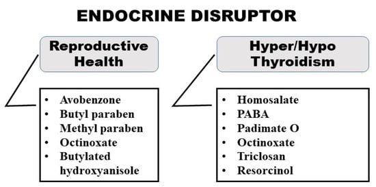 Endocrine disruptors are chemical substances that are capable of disrupting hormonal signals thus affecting the reproductive and nervous systems. Various grades of phthalate can prevent the synthesis of testosterone, while antimicrobial agents (triclosan) cause hypothyroidism []. We can generalize endocrine disruptors present in beauty products in two parts namely reproductive health endocrine disruptor and thyroid endocrine disruptor, as shown in Figure 5. Ingredients such as avobenzone, butylparaben, methylparaben, octinoxate, and butylatedhydroxyanisole (present in sunscreen and hair products) are reproductive health endocrine disruptors and can cause fertility abnormalities, skewed sex ratio, and in females can also cause menstrual problems []. Chemicals such as PABA, padimate O, homosalate, triclosan, octinoxate, and resorcinol can disrupt the thyroid hormone and can cause hyperthyroidism or hypothyroidism. Generally, there are no metabolic disruptors present in any beauty care products []. In a a study on the examination of urine samples of a specified group of adults, in more than 96% of the samples methyl/propylparaben was obtained. Several other studies have also reported the high concentration of parabens in various products, dermal penetrability, and its toxic effects [].
