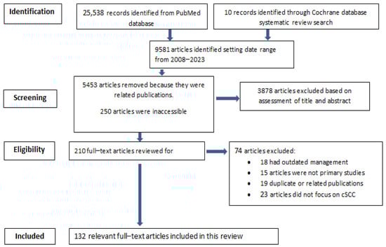 Each article was screened initially by title and abstract. Articles were provisionally included if any of the utilized key terms were found in its title or abstract. Following the initial screening, pertinent case reports, case series, systematic reviews, meta-analyses, prospective studies, retrospective studies, clinical trials and topic reviews were included. Full text articles that provided clinically relevant optical imaging diagnostic for cSCC, along with diagnostic features and up-to-date treatment protocols, were selected for full-text review. Advanced imaging modalities, such as nonlinear optical imaging, photoacoustic imaging, fast large area multiphoton exoscope, etc., which are not used in clinical setting yet, were not included in this review.