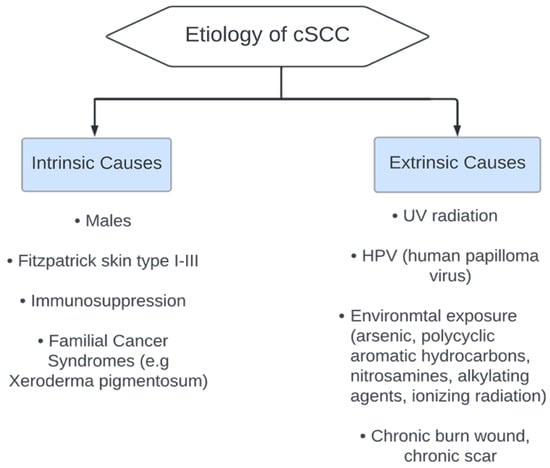 Defects in the production of antioxidant melanin or increased genetic instability can increase the risk of developing cSCC [41]. For example, albinism, the congenital absence of melanin, is highly associated with a high risk of cSCC development [42]. Uncommon familial cancer syndromes linked with defective DNA repair or photosensitivity can predispose younger individuals to develop multiple cSCC [41]. Xeroderma pigmentosum (XP) is another genetic condition that can predispose young individuals to develop skin cancer [43]. XP is an autosomal recessive pathology that decreases skin’s ability to repair DNA damage thus the median age of NMSC development is 18 years [43]. XP arises due to a defect in post-replication repair or DNA nucleotide excision [43,44]. Patients with XP can develop diffuse erythema, bullae, blisters, and ensuing xerosis and scaling with minimal sun exposure [43,44]. In patients with XP, there is 16-fold greater risk for developing cSCC [43,44]. Figure 2 summarizes etiological causes of cSCC.