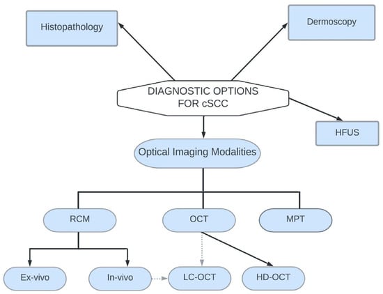 Over the past decade, dermatology has been revolutionized by the emergence of optical imaging diagnostic technologies. Confocal microscopy, optical coherence tomography, and multiphoton tomography serve as promising potential alternatives to traditional biopsy and excision [68]. Figure 4 summarizes the current diagnostic options for cSCC.