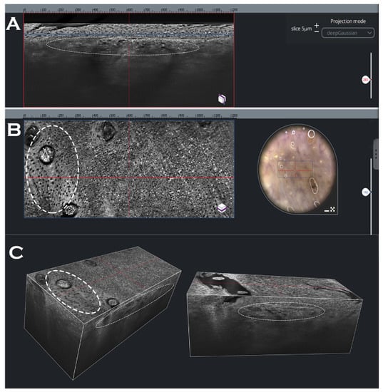 Line-field confocal optical coherence tomography (LC-OCT) features of squamous cell carcinoma. (A) Optical coherence tomography or en-coupe view showing ill-defined DEJ. (B) Confocal or en-face view highlighting atypical nuclei on left side and dermoscopic view on right side. (C) Three-dimensional view.
