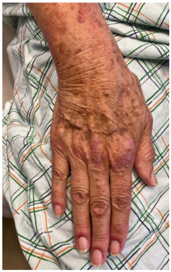- Qudsiya, Z.; Waseem, M. Dermatomyositis. In StatPearls [Internet]; StatPearls Publishing: Treasure Island, FL, USA, 2023; Available online: https://www.ncbi.nlm.nih.gov/books/NBK558917/ (accessed on 8 August 2023).