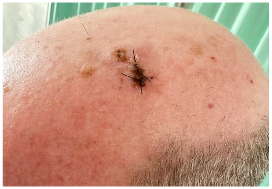 A 51-year-old man presented to the clinic with a scalp tumor that had progressed over the past 3 months. Moreover, our patient had a history of non-melanoma skin cancer on his shoulders 10 years ago, the nature of which was unfortunately unknown. The patient was not immunosuppressed and HIV-seronegative. He was not taking any medications. Neither heavy sunlight exposure nor family history of skin tumors were mentioned.
