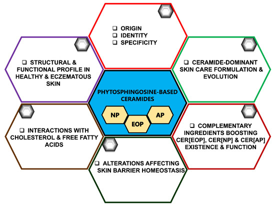 Herein, we review phytosphingosine-based CER[EOP], CER[NP], and CER[AP] as the principal repositories for the skin CERs’ behavior and profile (Figure 1) in healthy and diseased skin (specifically eczematous skin) in terms of their absolute quantities, physicochemical character, distribution, complex interaction with CHOL and FFAs, and organization within the SC in order to decipher their key structural and functional roles.