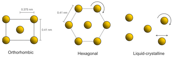 There are two primary packing conformations within the lipid lamellae: (1) orthorhombic packing (ORTHO) and (2) hexagonal packing (HEX). The unit cell/subcell of each of these conformations is shown in Figure 3. A third conformation, the liquid crystalline (LIQUID) conformation (Figure 3), also occurs, but there is no lateral organization and therefore, no defined unit cell/subcell in this conformation [53]. Of these, the ORTHO conformation involves the tightest packing arrangement of lipid molecules, and for this reason, it is the preferred conformation to maximize barrier integrity and minimize TEWL [59]. It is important to note that although our discussion is primarily focused on CERs, the system also includes CHOL and FFAs, which are also indispensable for the characteristic SC organization as they are likely to participate in the ORTHO lattice, provided their chain lengths are compatible [53]. The HEX conformation adopts a slightly looser (less dense) packing arrangement and allows for some rotational mobility about the z-axis (where the surface of the lamellar sheet lies on the x and y axes) but is also more permeable. The LIQUID conformation is the most disordered, with both rotational and translational mobility, and, if present to a high degree, results in the breakdown of the skin barrier integrity [60].