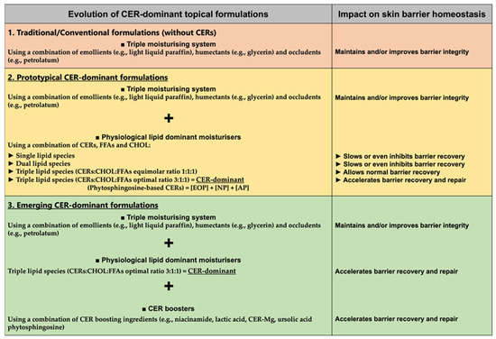 Many current management and/or therapeutic approaches known as CER-dominant formulations include a combination of the key CER subclasses, namely phytosphingosine-based CER[EOP], CER[NP], and CER[AP], as well as CHOL and FFAs. For example, double-CER combination containing CER[EOP] and CER[NP], and triple-CER combination containing CER[EOP], CER[NP], and CER[AP]) [36,37,38,39,40] combined with (1) CHOL and/or FFAs [37,38,39,40]; (2) conventional moisturizers (e.g., glycerin) [37,38,39,40]; (3) frequently used CER precursors/promoters/boosters, including niacinamide, lactic acid and phytosphingosine [37,38,39,40]; and (4) sporadically used CER-Mg [41] and ursolic acid [2] can complement the science of CERs and ‘prompt’ skin into making CERs in order to initiate or more likely to accelerate skin barrier recovery and repair [14]. Topical formulations that contain a complete and equimolar physiological mixture (1:1:1) of triple-lipid CERs:CHOL:FFAs are not harmful to disturbed or compromised skin; however, incomplete or imbalanced mixtures can potentially aggravate underlying barrier defects, presumably by destabilizing the functional properties of the skin’s lipid-based barrier [14]. Lately, triple-lipid topical formulations that contain a 3:1:1 optimal molar ratio of CERs:CHOL:FFAs (preferably with longer chains) have been extensively used to maintain healthy skin barrier or more often to accelerate disease-affected skin barrier recovery and repair, thus improving skin barrier health in a timely and effective manner [14].