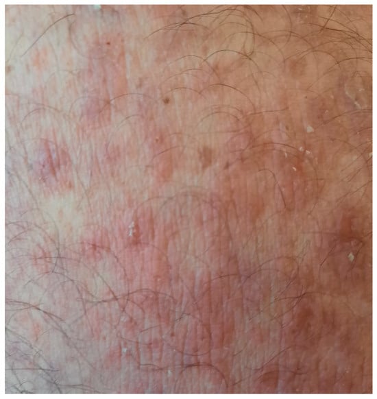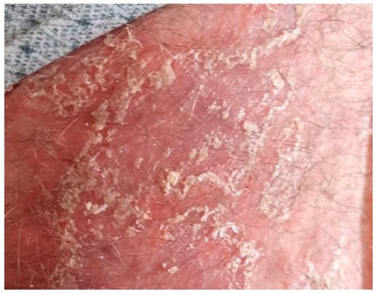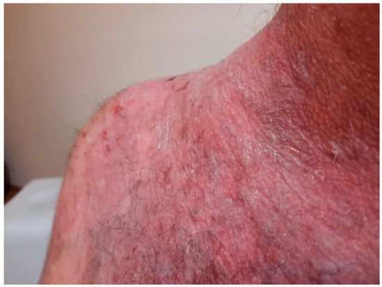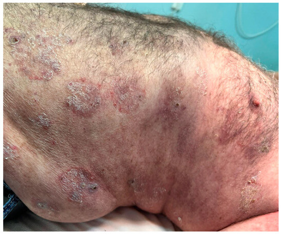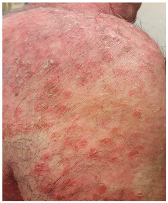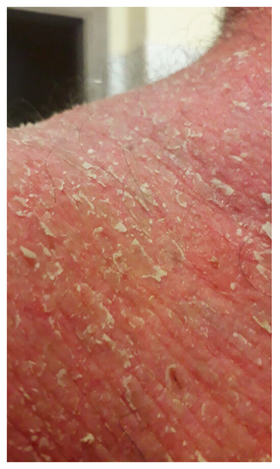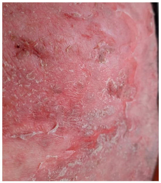 Pemphigus foliaceus (PF) is one of several subtypes of this skin disease and has certain clinical and histopathological particularities, affecting exclusively the skin, without any mucosal lesions [2]. In PF, the regions affected the most are typically the head and neck, as well as the thoracic region [1]. Patients with PF have autoantibodies specifically targeting desmoglein 1, resulting in superficial blistering and cutaneous erosions, with the sparing of the mucosae in the majority of cases [3]. Upon clinical examination, blisters/bullae or erosions may be observed, although areas of erythema, scaling, and crusting are also frequently encountered [4]. In cases presenting with diffuse lesions, the differential diagnoses also include exfoliative eczema [4]. In the absence of mucosal lesions, a PF diagnosis could be confounded with one type of psoriasis or several types of eczema, especially seborrheic dermatitis.