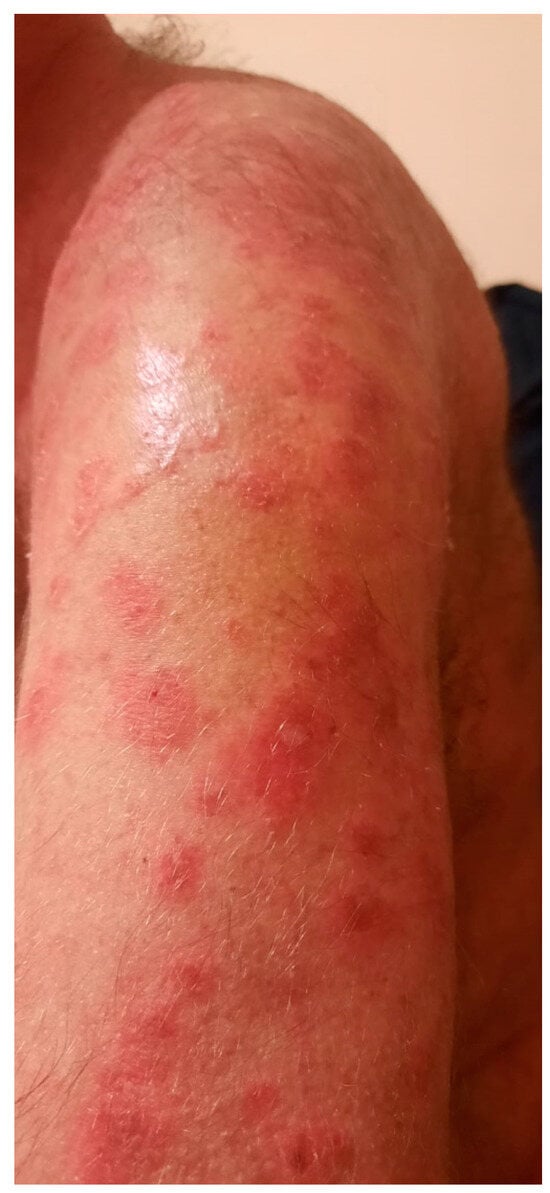 We present a 62-year-old man evaluated in a dermatology clinic with a slightly pruritic, red, and scaly plaque lesion located on the skin in the right supraclavicular region. He noted the lesions 2 months ago. He had no personal or familial history of any skin disorders or autoimmune diseases. He denied taking any new medications or applying any skin products or deodorants prior to the appearance of this lesion. After several weeks, new lesions occurred on the trunk and a clinical diagnosis of pityriasis rosea was made. He was treated with topical corticosteroids (methylprednisolone acetate, a daily application for 3 weeks), but, despite this treatment, the lesions continued to enlarge and to spread to the whole body’s skin surface. He was clinically reevaluated and a new diagnosis of psoriasis vulgaris was made. He was prescribed topical applications of clobetasol propionate 0.05% cream once daily for 4 months. However, the lesions continued to evolve and some transformed into many superficial blisters that were easily broken. The unroofed blisters were followed by scaly and crusted erosions (Figure 1 and Figure 2). There was no mucosal involvement during the disease course.
